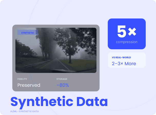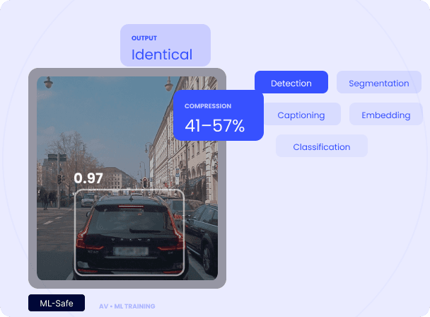 ML-safe video data compression, half the footprint in real-world and synthetic footage. Proven in OEM pipelines.